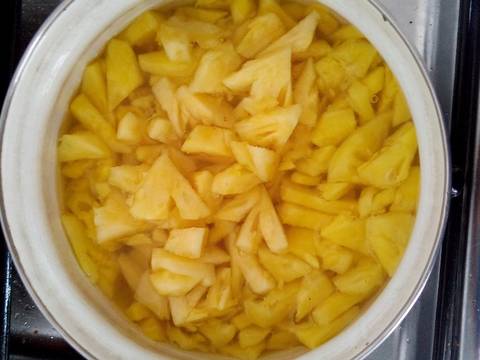 Rebus 400 ml air dengan gula dan garam sampai mendidih kemudian masukkan potongan nanas, aduk sebentar, matikan api.